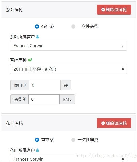 我們想制作一個模塊來動態(tài)為每一個新的茶葉消耗增加一個消耗選擇區(qū),即點擊新增消耗后,會動態(tài)增加一個新的茶葉消耗區(qū)域:
