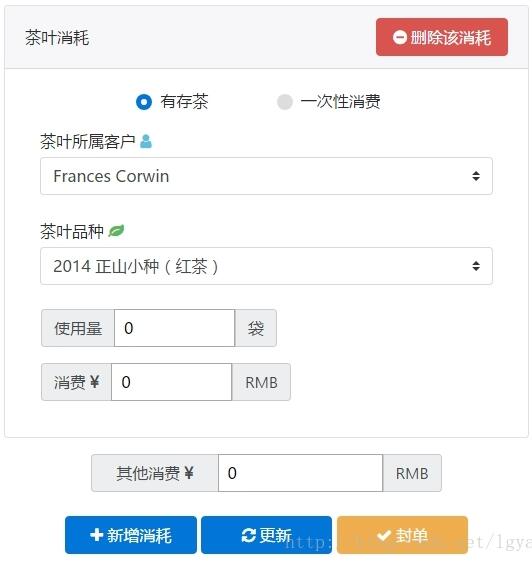 這里我使用的是jQuery + Laravel(當(dāng)然如果使用了其他框架,基本的概念也是不變的)。如圖,假設(shè)我們制作了一個頁面來管理客戶的茶葉消耗: