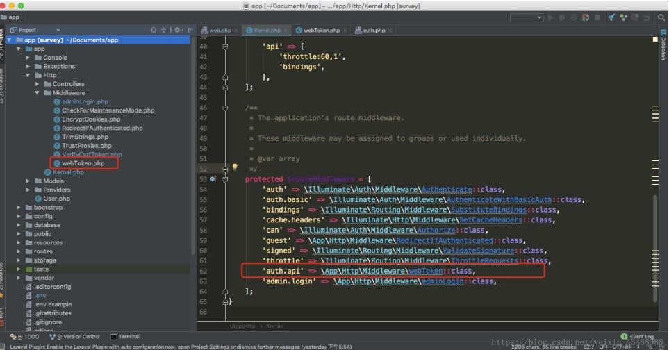 在Middleware文件創(chuàng)建WebToken.php,然后在Kernel.php文件中注冊該中間件