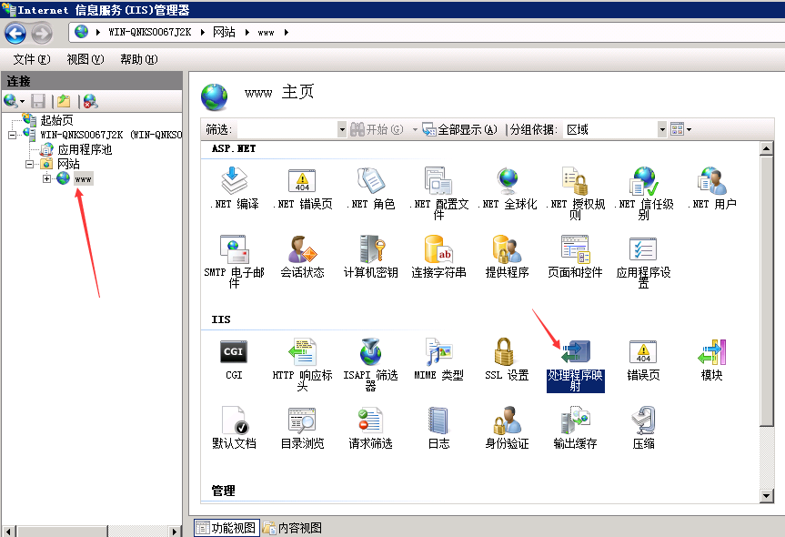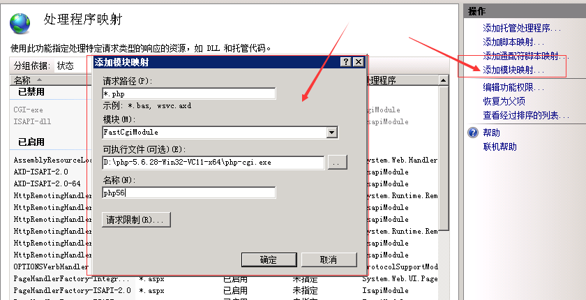 接下來配置IIS的“處理程序映射”,配置方法以及內(nèi)容見下圖