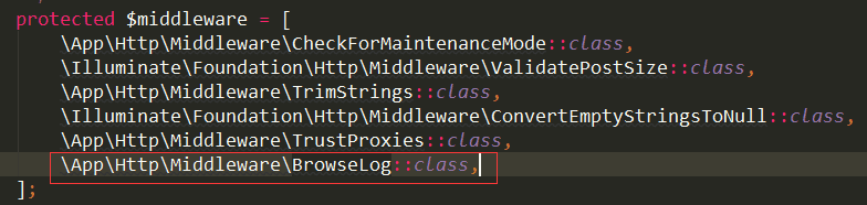定義一個(gè)全局中間件,每一次請(qǐng)求都會(huì)被執(zhí)行。執(zhí)行 php artisan make:middleware BrowseLog,創(chuàng)建了 app/Http/Middleware/BrowseLog.php 文件。