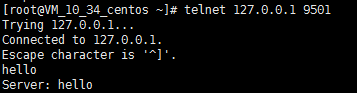 使用telnet連接TCP服務(wù),輸入hello,服務(wù)器返回hello即測試成功: