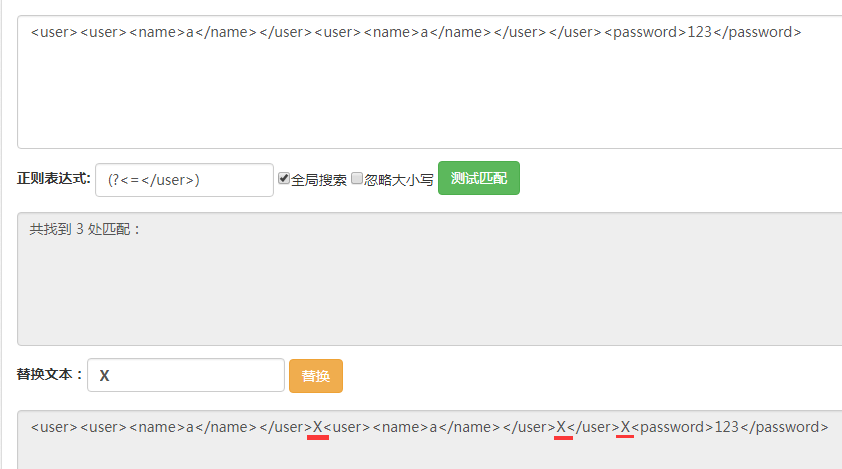 其次,再這三個(gè)位置上進(jìn)行篩選,能夠看出這三個(gè)位置的區(qū)別是后面是否有/user>,如果沒有的話那么它就是最后一個(gè)/user>后面的位置。在之前的表達(dá)式后面添上(?![\w\W]*?/user>)此時(shí)表達(dá)式變?yōu)?code>(?=/user>)(?![\w\W]*?/user>)。