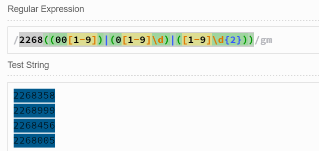 我們可以把2268001-2268999劃分為2268001-2268009和2268010-2268099和2268100-2268999。這樣,把驗證三者的正則表達式組合起來即可。如下所示: