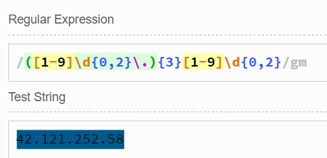 我首先ping到了https://www.jb51.net/的IP地址:42.121.252.58。 實際上IP地址一般是1~3位整數(shù).1~3位整數(shù).1~3位整數(shù).1~3位整數(shù),于是我們可以通過下面的正則表達式作簡單驗證: