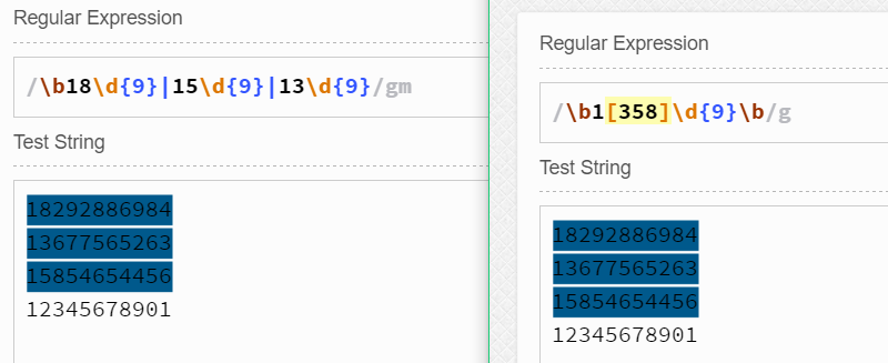 上述幾種方式效果相同,更推薦第一種,它更加簡潔! 注:后面我都會使用較為簡潔的正則表達式,而不會太過啰嗦!