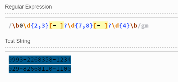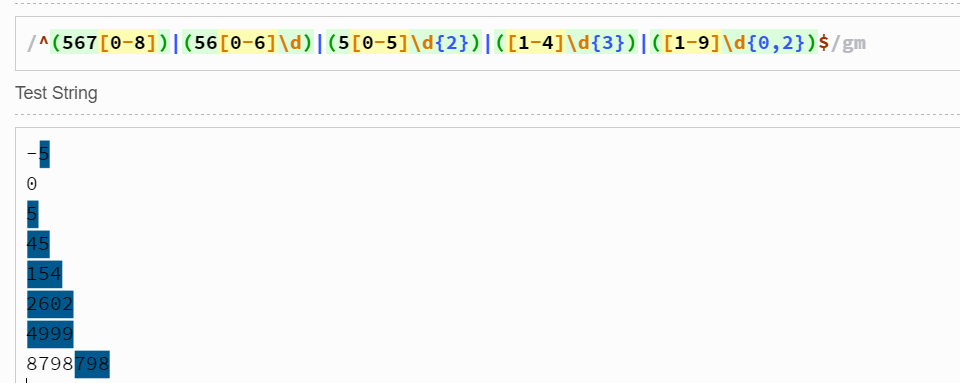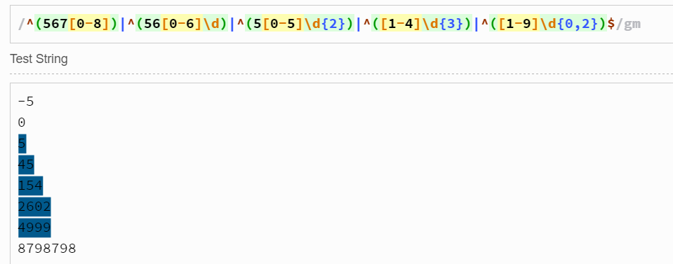 我們可以看到021 -56由于不是正數(shù),不會被選中。(注意:其中用到了^,表示必須以0或者[1-9]開頭,因此-56沒有被選中;如果沒有^,那么-56中的56會被選中)