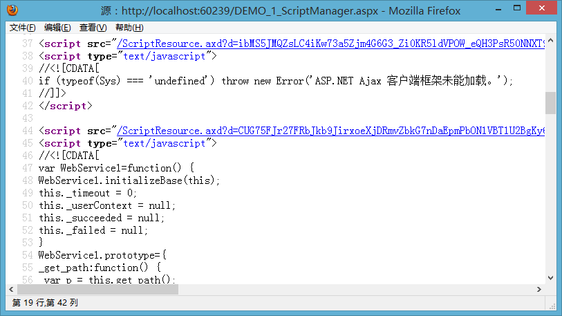 從截圖可以看到,除了引入了二個(gè)必要的AJAX客戶端類庫(kù)外,還在客戶端為WebService1生成了代理腳本。