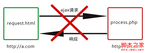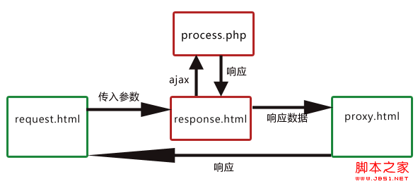 要實(shí)現(xiàn)域a.com的request.html請求域b.com的process.php,可以將請求的參數(shù)通過URL傳給response.html,由response.html向process.php發(fā)出真正的ajax請求(response.html與process.php都屬于域b.com),然后將返回的結(jié)果通過URL傳給proxy.html,最后由于proxy.html與request.html是在同一域下,所以可以在proxy.html利用window.top將結(jié)果返回給request.html完成跨域通信。