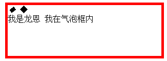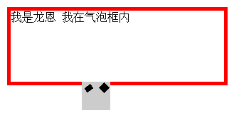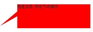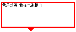 div class="longen"> div class="arrow"> em>#9670/em> span>#9670/span> /div> 我是龍恩 我在氣泡框內(nèi)/div> .longen{ width:300px; height:100px;position:relative; border:5px solid red; margin:50px auto 0;}.arrow{ position:absolute; width:40px; height:40px; left:100px; bottom:-40px;overflow:hidden;}.arrow *{position:absolute; font-size:40px; line-height:40px; width:40px; font-family:SimSun; font-style:normal; font-weight:normal; text-align:center; vertical-align:middle;}.arrow em{ color:red; top:-15px;}.arrow span{ color:#fff; top:-21px;}