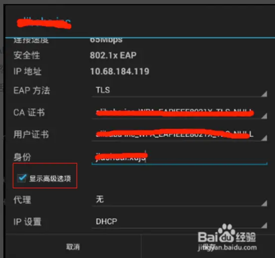 ->“WLAN”,找到你要連接的網(wǎng)絡(luò),在上面長按,然后選擇“修改網(wǎng)絡(luò)”,彈出網(wǎng)絡(luò)設(shè)置對話框,然后勾選“顯示高級選項”