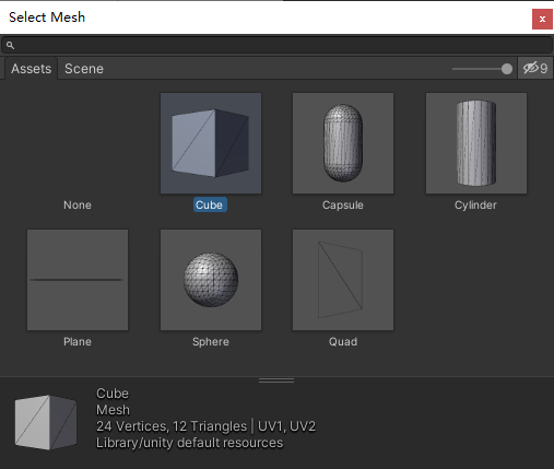 MeshFilter是網(wǎng)格過濾器,我們需要通過它設(shè)置引用的網(wǎng)格資源,比如這里引用的是一個Cube(正方體)網(wǎng)格。