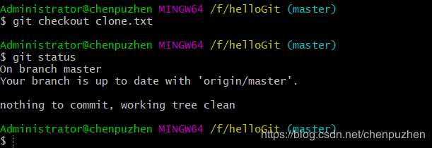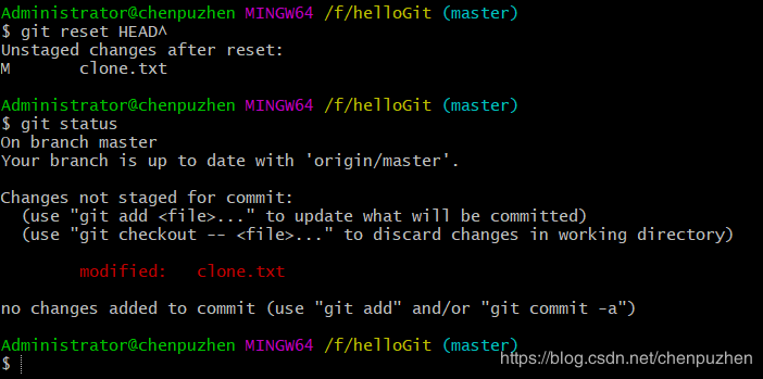 還有個命令提示:git checkout --file> to discard changes in working directory這個意思就是下載某某文件,丟棄掉該文件在工作區(qū)的改變內(nèi)容。姑且就這么翻譯吧。就是把文件還原了,工作區(qū)的修改也沒了。我們執(zhí)行該命令查看狀態(tài),如圖: