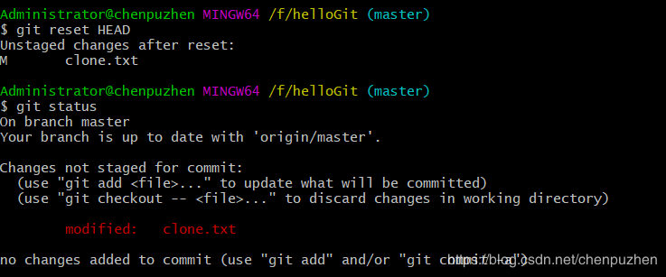 說明git reset HEAD操作只對暫存區(qū)起效果,不對工作區(qū)的內(nèi)容起效果。所以我們要想修改掉工作區(qū)的內(nèi)容還得繼續(xù)執(zhí)行命令進行還原。根據(jù)上面的截圖提示,git add是添加,因為我們發(fā)現(xiàn)了錯誤才回退的,所以肯定不能執(zhí)行這個了。