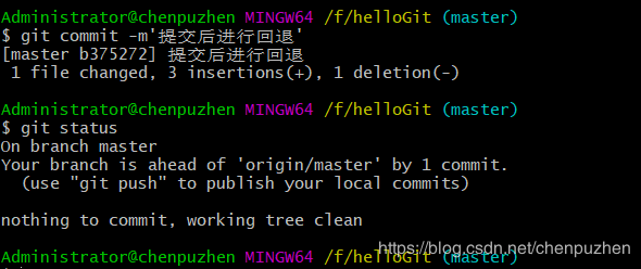 如圖,我已經(jīng)commit了,還沒有push,push的內(nèi)容我們先不管,push這個命令其實和提交沒關系,他只是推送到遠程了,如果push了,也就是我們回退了之后,再重新push一下而已,所以請不要糾結push這個操作。他和提交版本其實沒有關系的。