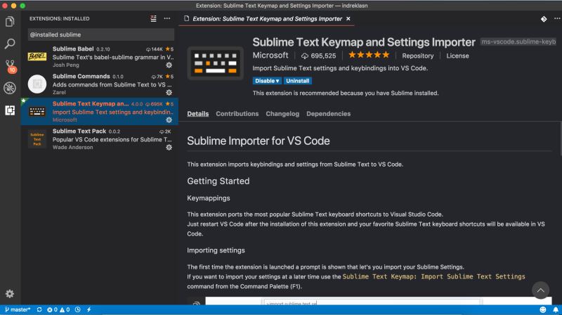 不知道有多少同學(xué)和我一樣比較喜歡用Sublime Text。雖然ST3也非常強大,可以用來寫JS代碼,但是我覺得它還是比不上專業(yè)的IDE,所以我更喜歡把ST3當(dāng)作「記事本」來用,如果你已經(jīng)比較習(xí)慣了ST3的快捷鍵,并且不想因為使用VSC而改變這個習(xí)慣,那么就可以使用這個插件,它會在VSC中模仿ST3的快捷鍵設(shè)置。
