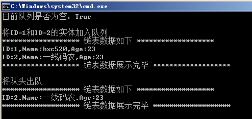 queueManage.SeqQueueIn(seqQueue, new Student() { ID = 1, Name = "hxc520", Age = 23 });