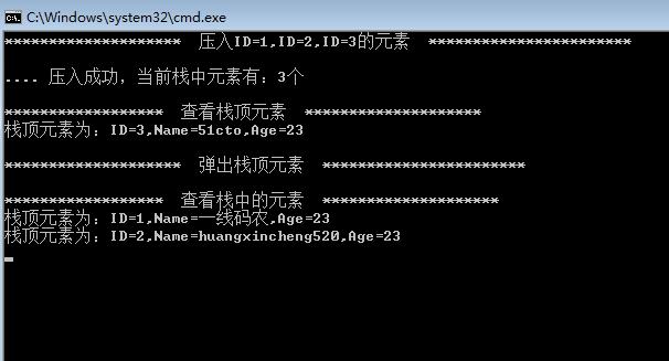 stackManager.SeqStackPush(seqStack, new Student() { ID = 2, Name = "huangxincheng520", Age = 23 });