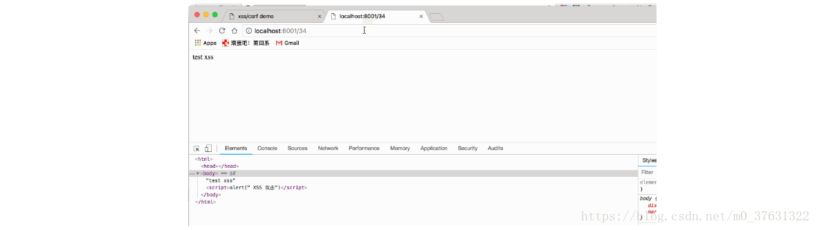 當(dāng)用戶點(diǎn)擊惡意鏈接時(shí),頁面跳轉(zhuǎn)到攻擊者預(yù)先準(zhǔn)備的頁面,會發(fā)現(xiàn)在攻擊者的頁面執(zhí)行了 js 腳本: