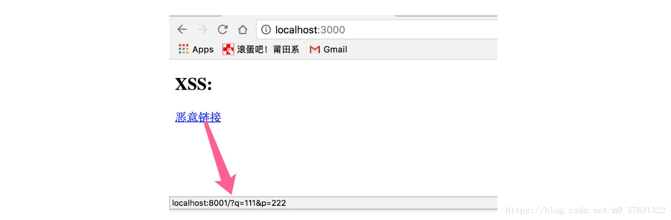 惡意鏈接的地址指向了 localhost:8001/?q=111p=222。然后,我再啟一個(gè)簡單的 Node 服務(wù)處理惡意鏈接的請求: