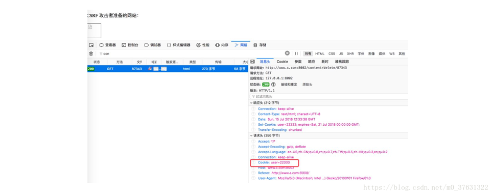 如發(fā)起 http://www.c.com:8002/content/delete/87343 請求時(shí),會刪除 id 為 87343 的帖子。當(dāng)用戶登錄之后,會設(shè)置如下 cookie: