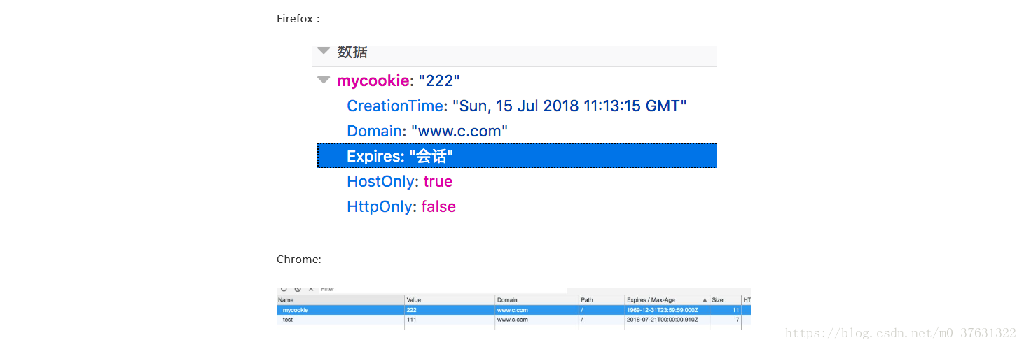 上述代碼創(chuàng)建了兩個(gè) Cookie:mycookie 和 test,前者屬于會話期 Cookie,后者則屬于持久性 Cookie。當(dāng)我們?nèi)ゲ榭?Cookie 相關(guān)的屬性時(shí),不同的瀏覽器對會話期 Cookie 的 Expires 屬性值會不一樣:
