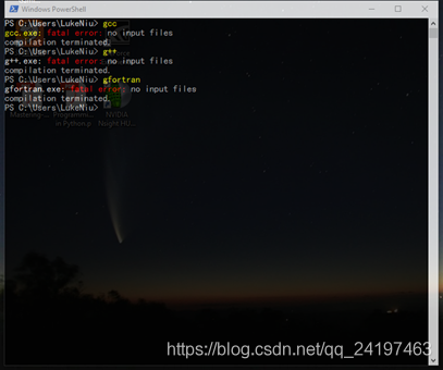 此處檢查一下編輯器是否可用,打開(kāi)命令行窗口,輸入gcc, g++, 或者gfortran, 如果提示找不到輸入文件, 那么就表明GNU Complier環(huán)境變量配置成功了, 如果顯示: gcc/g++/gfortran is not recognized as the name of a cmdlet, function, script file, or operable program. 則表示GNU Complier環(huán)境變量沒(méi)有配置成功, 這是成功的: