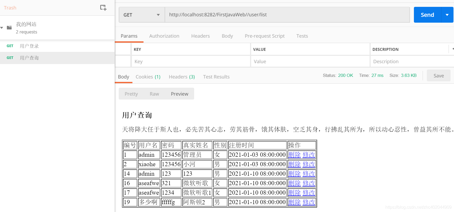 這節(jié)介紹接口測試工具postman的基本使用方法, 測試系統(tǒng)就是2.8節(jié)自己開發(fā)的具有用戶增刪改查操作的web應(yīng)用程序——[FirstJavaWeb](https://www.jb51.net/article/203984.htm)。 執(zhí)行測試前,確保FirstJavaWeb應(yīng)用程序處于啟動中。