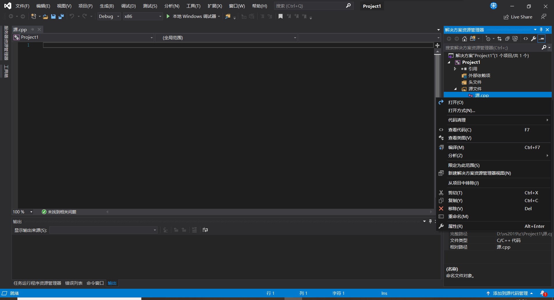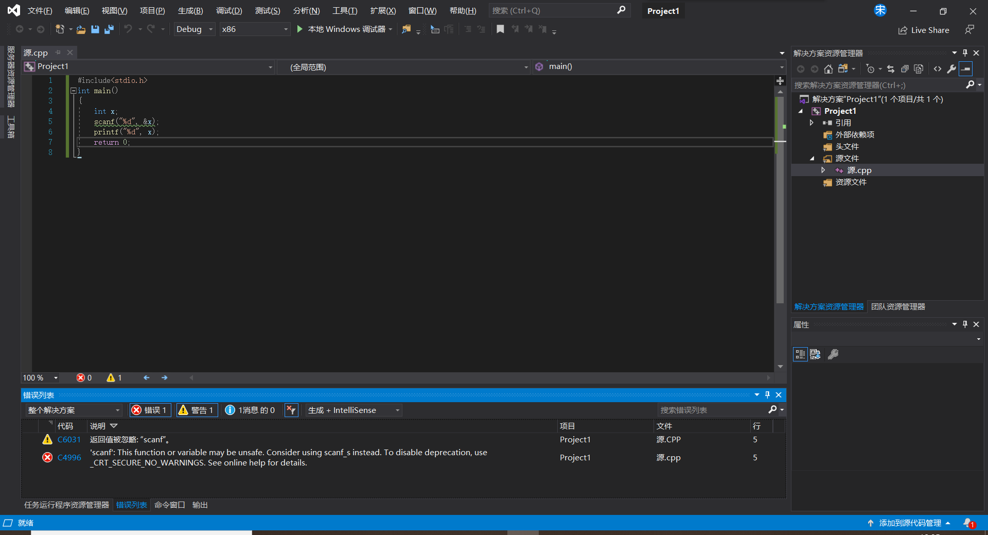 此時(shí)雖然仍然會(huì)有警告出現(xiàn),但是已經(jīng)不影響程序的調(diào)試運(yùn)行了,但是這個(gè)方法的缺點(diǎn)就是每一次創(chuàng)建新的c++文件的時(shí)候都要改一次屬性,比較麻煩。