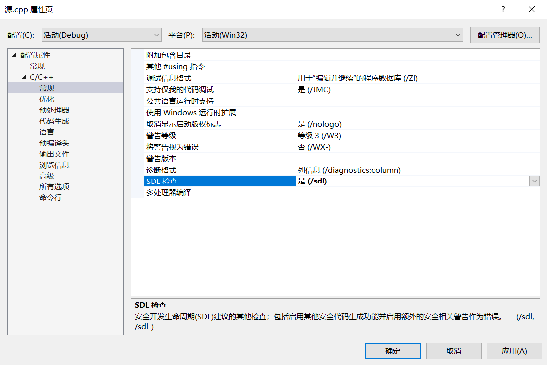 此時(shí)常規(guī)中的SDL選項(xiàng)現(xiàn)實(shí)的是“是 (/sdl)”