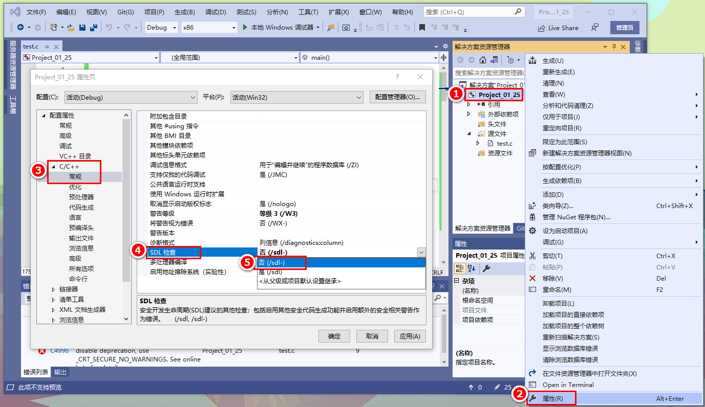 關(guān)閉步驟:右鍵“項目文件” —— “屬性” —— “配置屬性” ——“C/C++”——“常規(guī)”——“SDL檢查”改為“否”即可,如圖所示