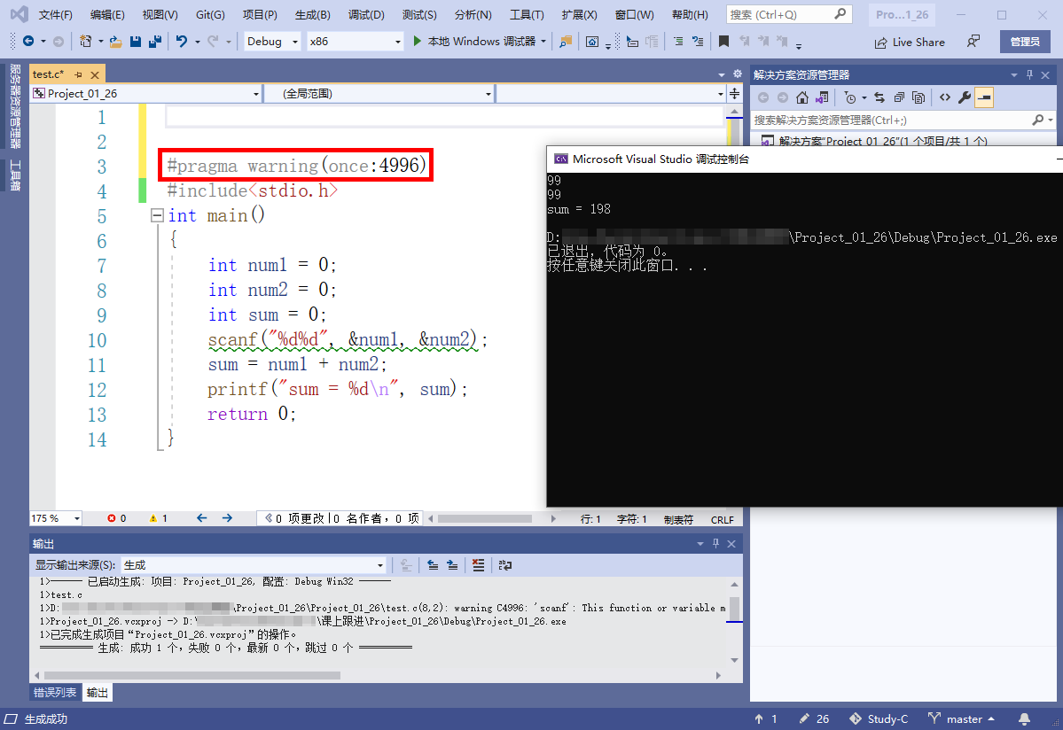 在C語言程序開頭添加代碼: #pragma warning(once:4996)//僅顯示一個