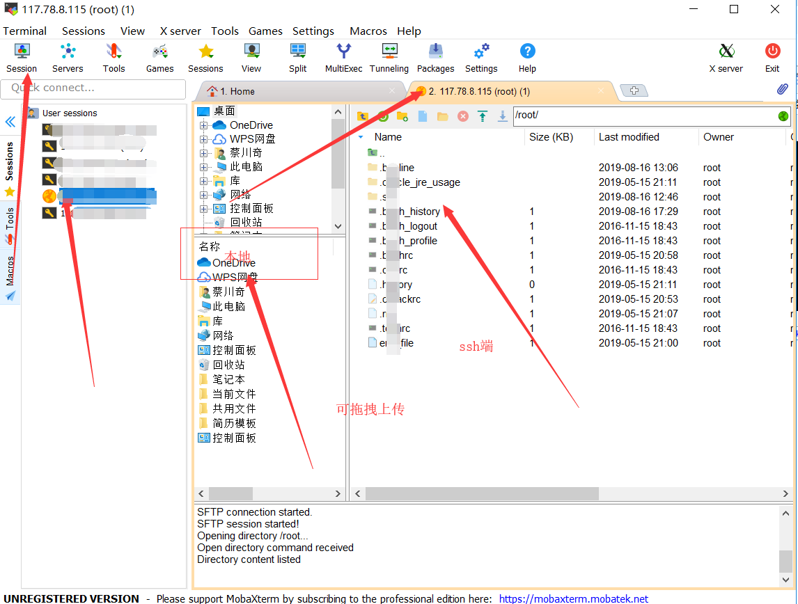文件拖拽上傳打開 Mobaxterm 工具的控制臺,點擊 sftp 欄,切換到控制臺的圖形化界面。Mobaxterm 支持文件從本地到控制臺的拖拽上傳。點擊上傳