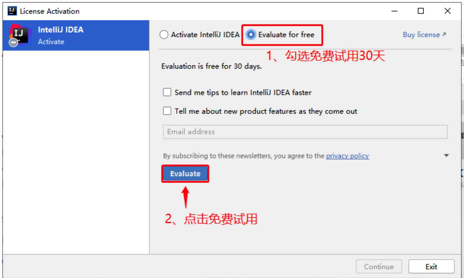 6.等待 IDEA 2021.1 運行, 中間會先彈出一個注冊框,我們勾選 Evaluate for free, 點擊 Evaluate, 先試用30天: