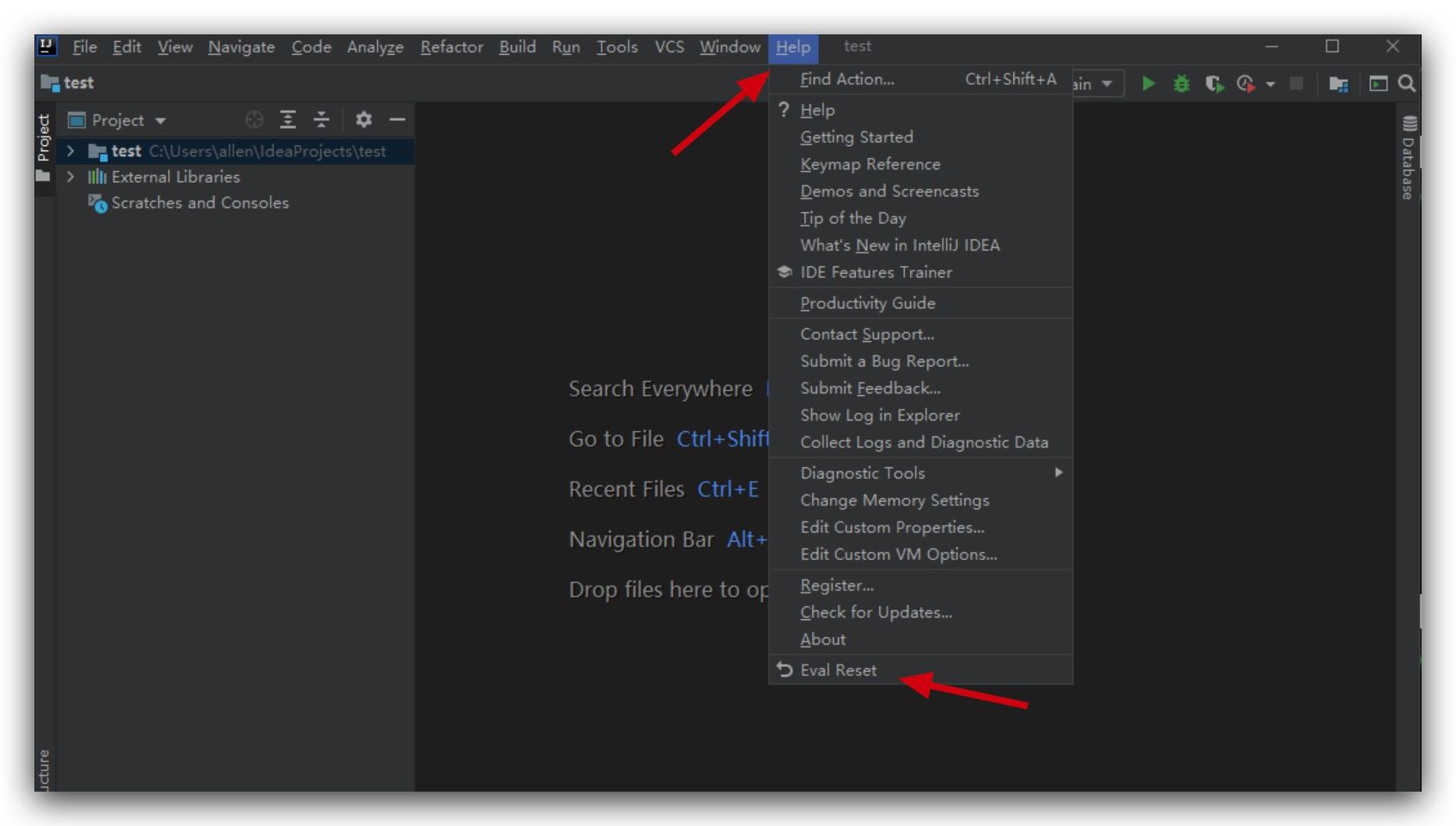 如果IDE沒有打開項目,在Welcome界面點擊菜單:Get Help -> Eval Reset如果IDE打開了項目,點擊菜單:Help -> Eval Reset
