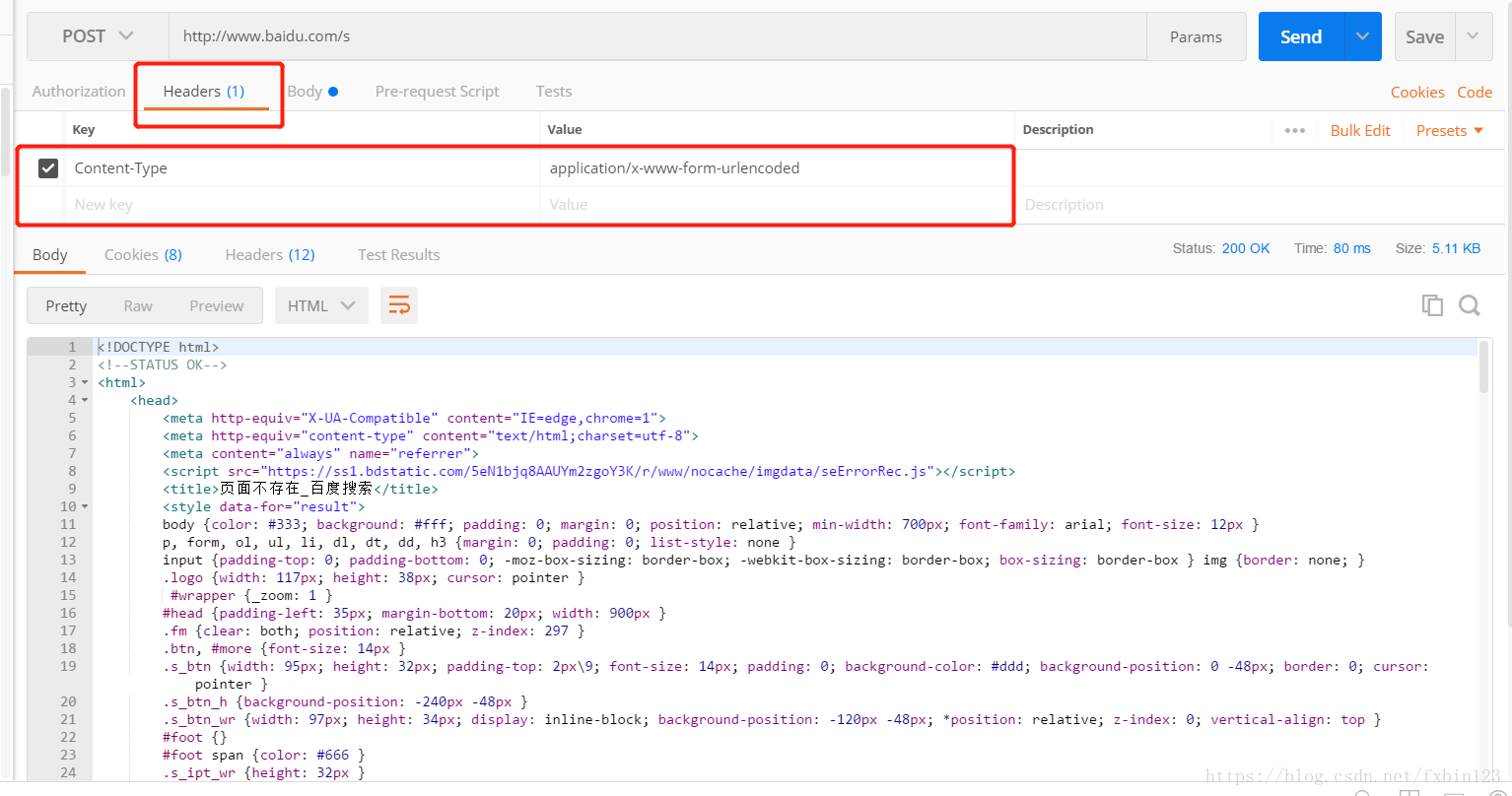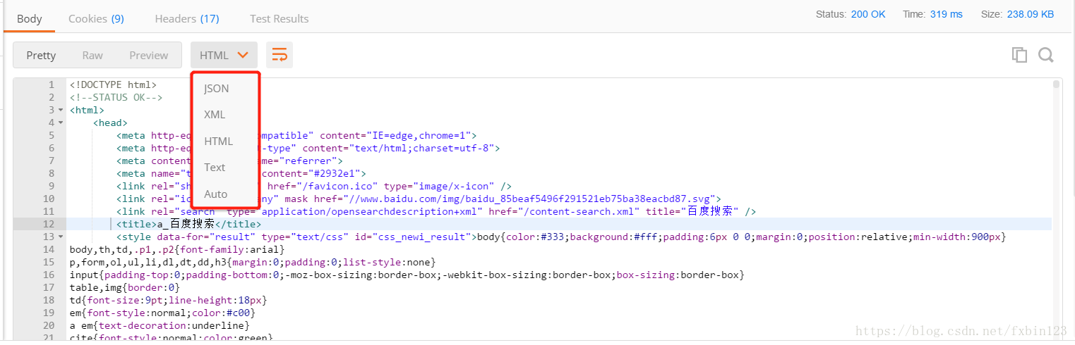 響應(yīng)體示例: 響應(yīng)的格式可以有多種,我這里由于請(qǐng)求的是 百度,so, 響應(yīng)的是 html ,