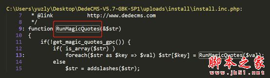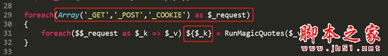 1、查看/install/index.php源碼,發(fā)現(xiàn)存在變量覆蓋漏洞,該代碼的意思是將get,post或者cookie方式傳入的值通過foreach以鍵值對(duì)的方式輸出,例如在url中輸入?str=hello,則$_k的值就是str,$_v的值就是hello,所以${$_k}就是$str, 后面的RunMagicQuotes函數(shù)在另一個(gè)文件中定義的,大致就是對(duì)參數(shù)進(jìn)行過濾然后返回參數(shù)內(nèi)容。