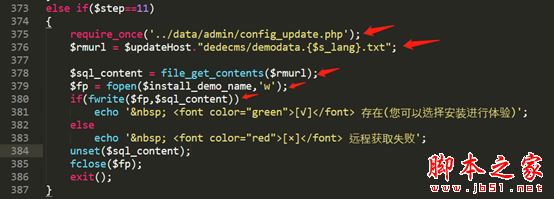 4.2、繼續(xù)看373-387行代碼,$updateHost與dedecms/demodata.{$a_lang}.txt拼接為字符串,并利用files_get_contents函數(shù)讀取demodata.{$s_lang}.txt文件內(nèi)容,最后將該文件內(nèi)容寫入到$install_demo_name參數(shù)中。