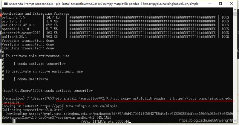 pip install tensorflow==2.0.0-rc0 numpy matplotlib pandas -i https://pypi.tuna.tsinghua.edu.cn/simple