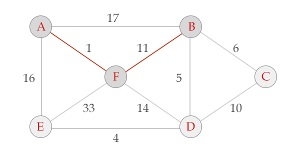 選中邊BC, V = {A, B, F, D, E, c}, E = {(A,F), (F,B), (B,D), (D,E), (B,C)}, 算法結(jié)束。