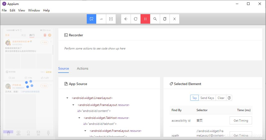 可以看到,現(xiàn)在我們的微博手機界面已經(jīng)在Appium軟件上顯示了。下面,我們可以使用上面的眼睛按鈕,監(jiān)聽我們要操作的步驟,然后保存為一個動作鏈。