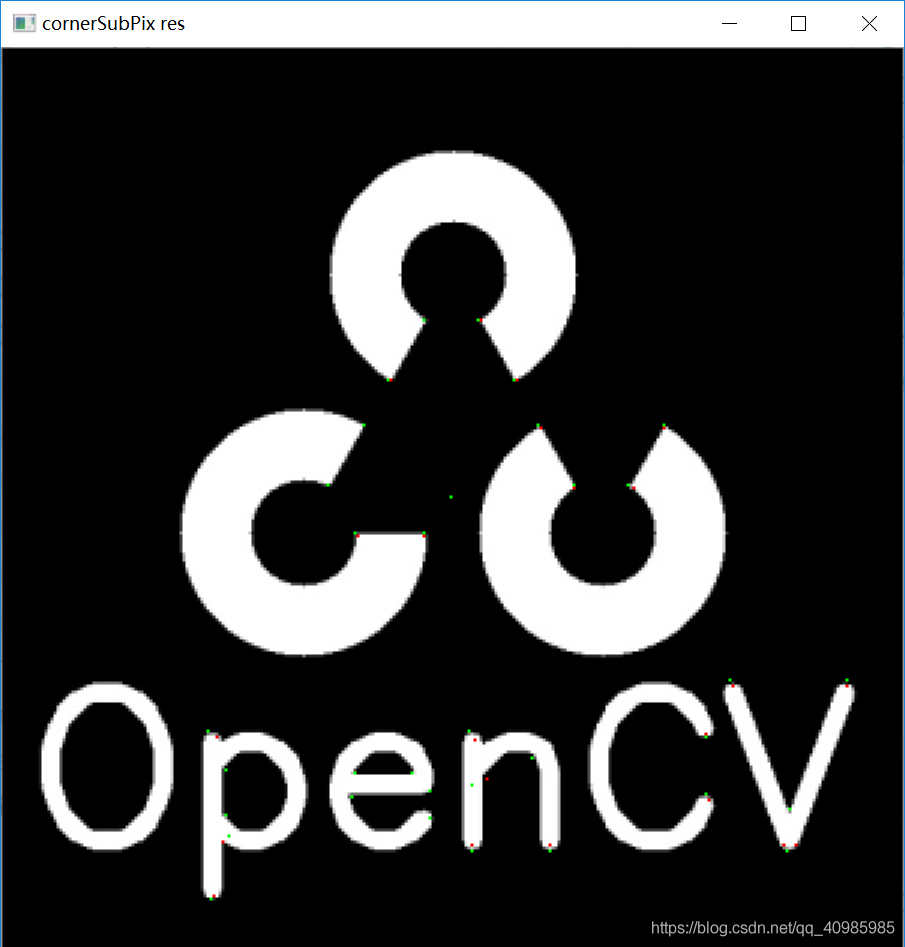 驚細(xì)角點(diǎn)效果圖如下:Harris角點(diǎn)用紅色像素標(biāo)記,精細(xì)角點(diǎn)用綠色像素標(biāo)記