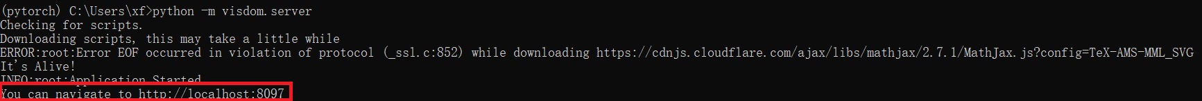 安裝完成后,運(yùn)行下面的代碼啟動(dòng)visdom服務(wù)器(運(yùn)行需要時(shí)間,需要稍等一下;下圖中的報(bào)錯(cuò)ERROR我沒(méi)有管,不影響正常運(yùn)行):