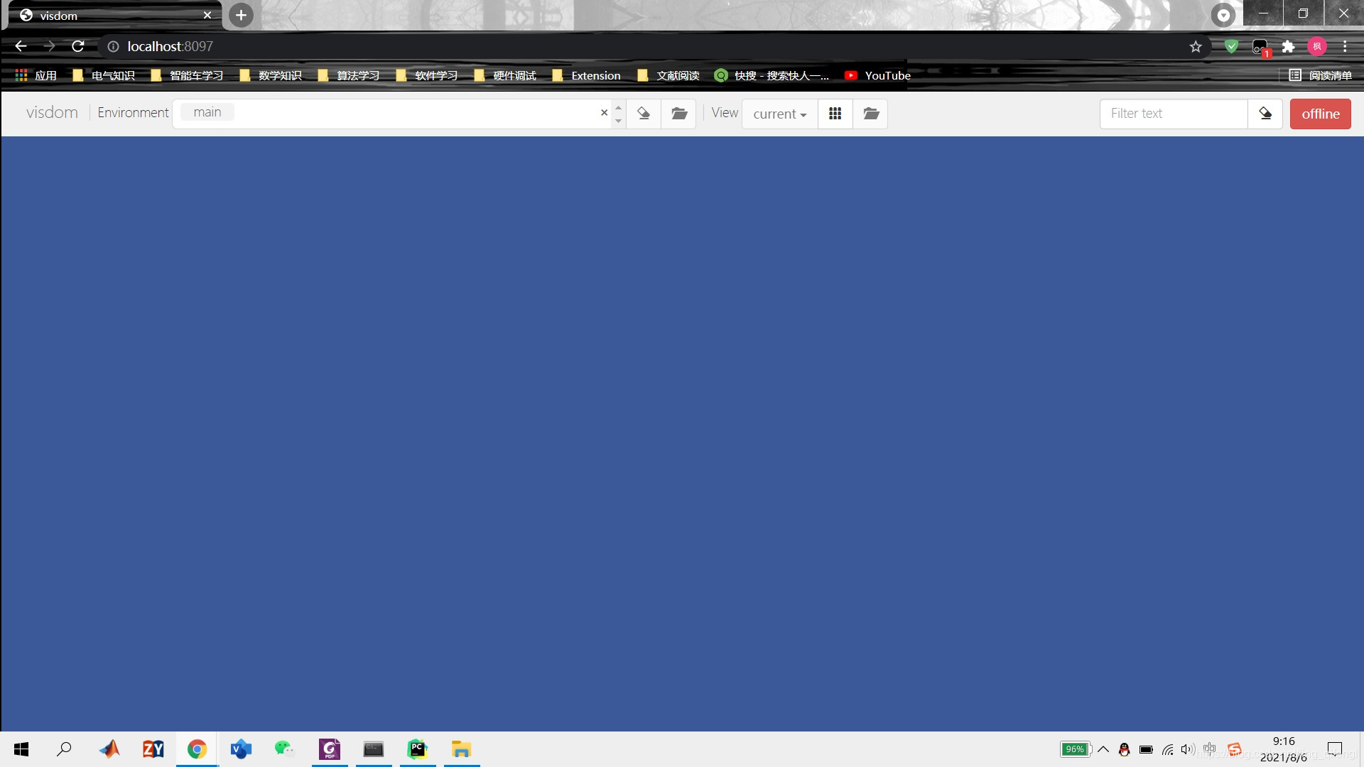 按照提示,在瀏覽器中輸入http://localhost:8097就可以訪(fǎng)問(wèn)visdom了。初始界面如下圖所示,是一個(gè)沒(méi)有任何視窗的main環(huán)境。