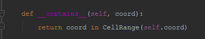 我們巡著openpyxl.worksheet.merge.MergedCellRange查找其源碼,發(fā)現(xiàn)定義了in操作,可以直接通過in確認(rèn)某個(gè)坐標(biāo)是否位于區(qū)域內(nèi)