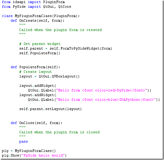 為了從 IDAPython 編寫 UI,您必須繼承 idaapi.PluginForm類。這個(gè)類本質(zhì)上包裝了 create_tform()/display_tform() 并提供了一些輔助函數(shù)(例如將 QWidget* 傳遞給 Python,PySide 可以將其用作父小部件)。