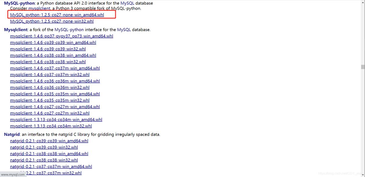 下載包地址:https://www.lfd.uci.edu/~gohlke/pythonlibs/#mysql-python