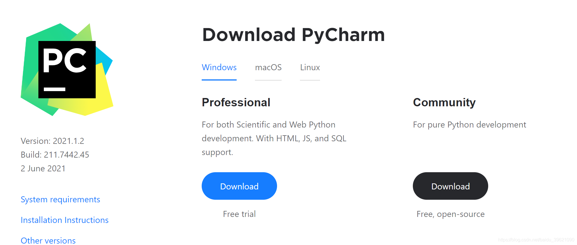下載地址:http://www.jetbrains.com/pycharm/download/#section=windows