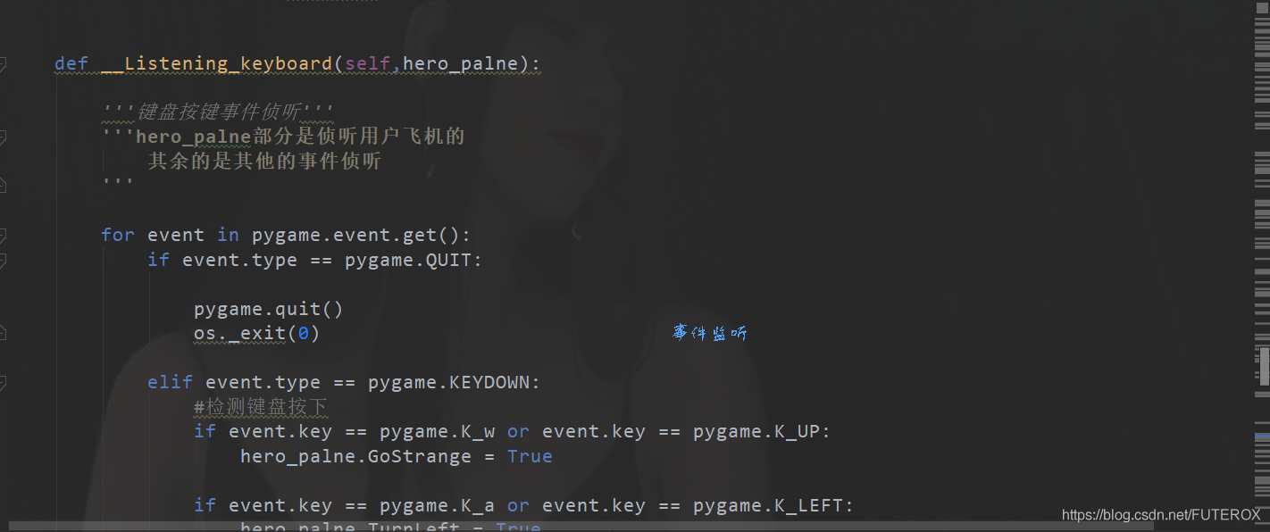 具體思路是用pygame.event.get()進行事件檢測。之后檢測到按下某一個按鍵,例如向前移動是,就會設置向前移動的信號,那么這個時候飛機就會一直往前走。當松開后,那么設置信號為假,那么飛機就會停下來。由于飛機會一直在循環(huán)里面檢測有沒有按下那個向前,所以當你長按往前時,飛機會一直往前,直到你松開。