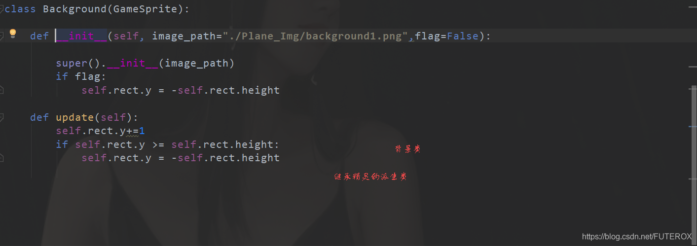 屏幕繪制直接使用pygame.display.set_mode()的bitl()繪制方法,進行繪制。當然這里的背景是會動的。所以使用到了一個精靈的派生類。